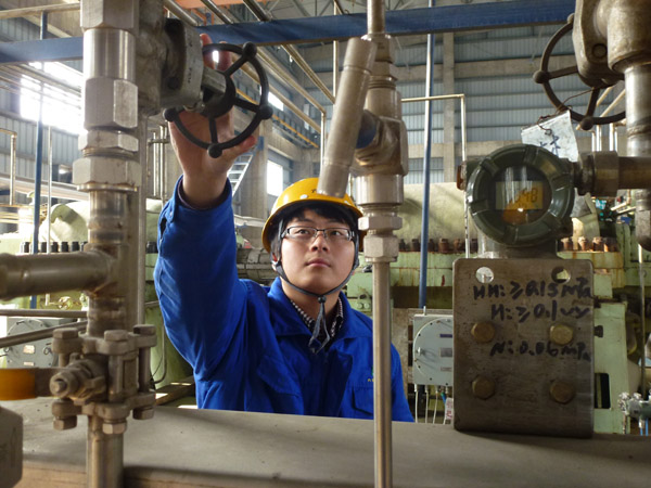 圖為合成工段操作人員正按工藝要求調節閥門。