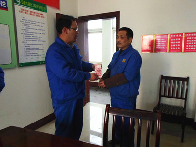 圖為1月3日下午,z6mg人生就是博化工機運車間黨支部將募集到的13760元現(xiàn)金送交到金長嶺丈夫手中。(高翠葉 攝)