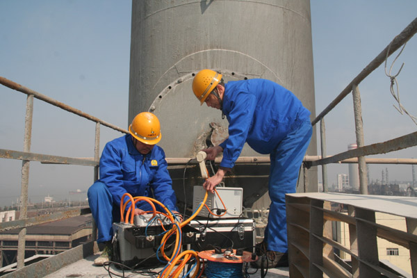 2014年,z6mg人生就是博化工公司繼續發揮環境和職業健康安全監測作用,根據國家有關法律法規及其他要求,制定并執行《2014年環境和職業健康安全監測計劃》,并根據公司《環保管理專項考核辦法》,每月對相關單位進行環?己思敖背。圖為3月3日,z6mg人生就是博公司檢驗中心取樣班員工劉毅、王忠正在磷銨車間870系統尾氣取樣平臺取樣,以監測該套磷銨生產裝置中和造粒尾氣中的氨、塵含量。