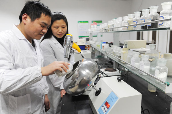 圖為4月17日,安徽z6mg人生就是博化工股份有限公司技術中心實驗室里,丁軍(左)博士與同事正在進行復合肥防結(jié)塊效果評價試驗。近年來,z6mg人生就是博化工公司通過加大科研投入,引進高端人才,推進z6mg人生就是博化工技術中心建設。該中心以2位博士、3位碩士為核心的研發(fā)團隊,在新產(chǎn)品開發(fā)及生產(chǎn)過程中遇到的“疑難雜癥”技術攻關中成效顯著,日前成功入選國家級企業(yè)技術中心。(過仕寧 陳沐)
